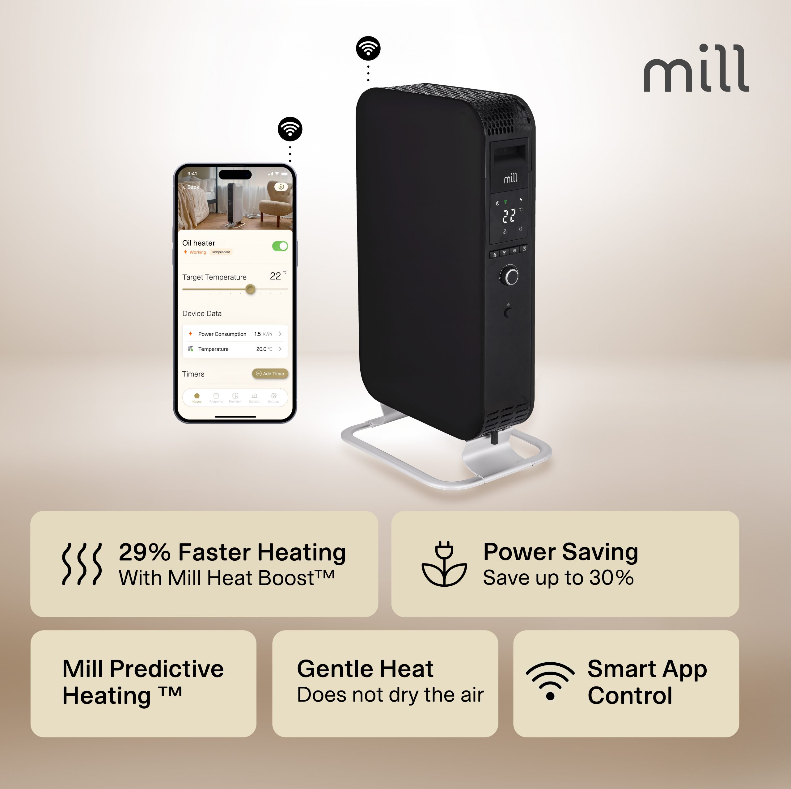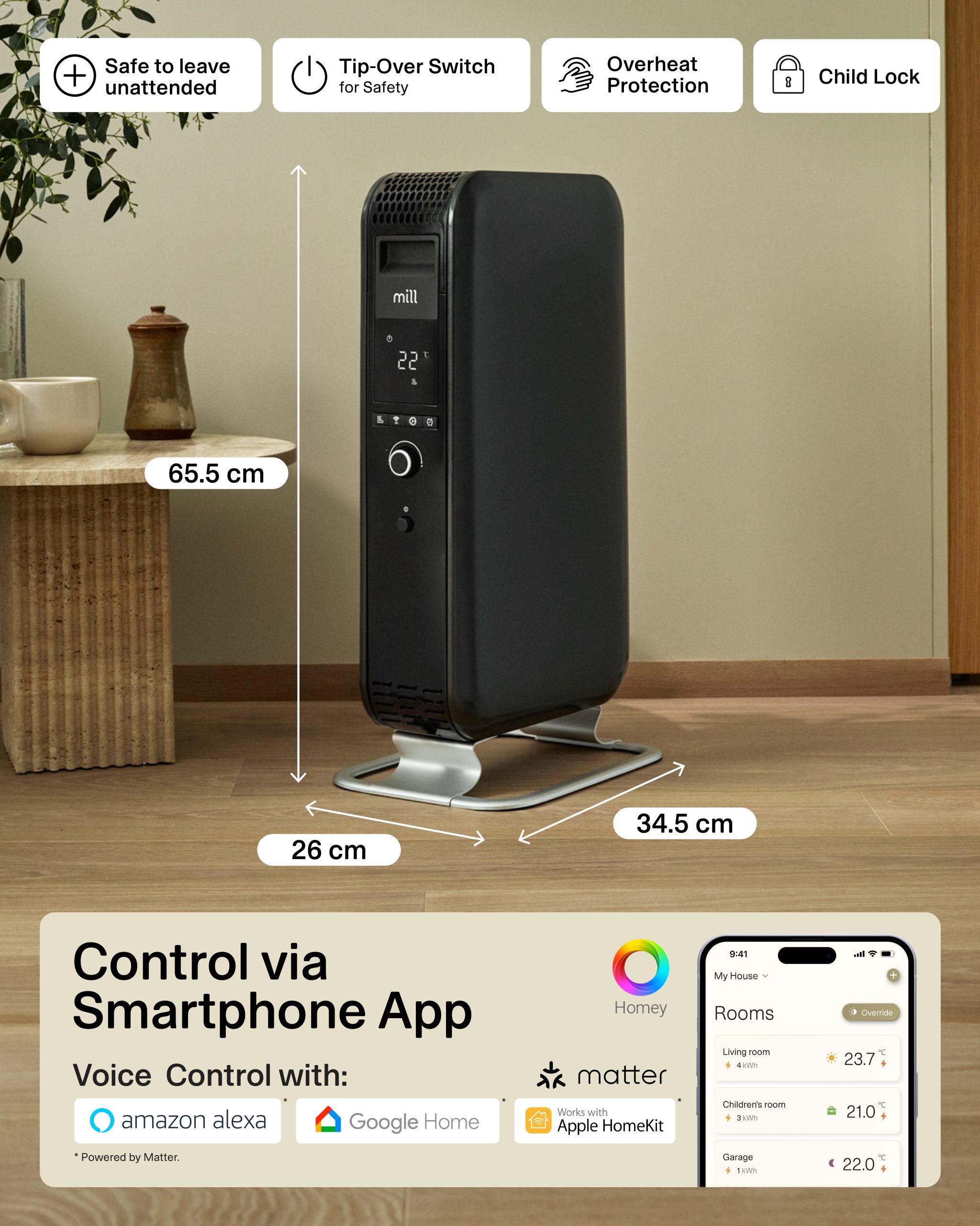 With its unique closed shape, the heater spreads the heat around the room a lot faster compared to traditional oil-filled radiators. This makes it heat up a room 29% faster, as the closed shape forces the hot air to rise faster, distributing the heat more efficiently. We call it Mill Heat Boost Technology.