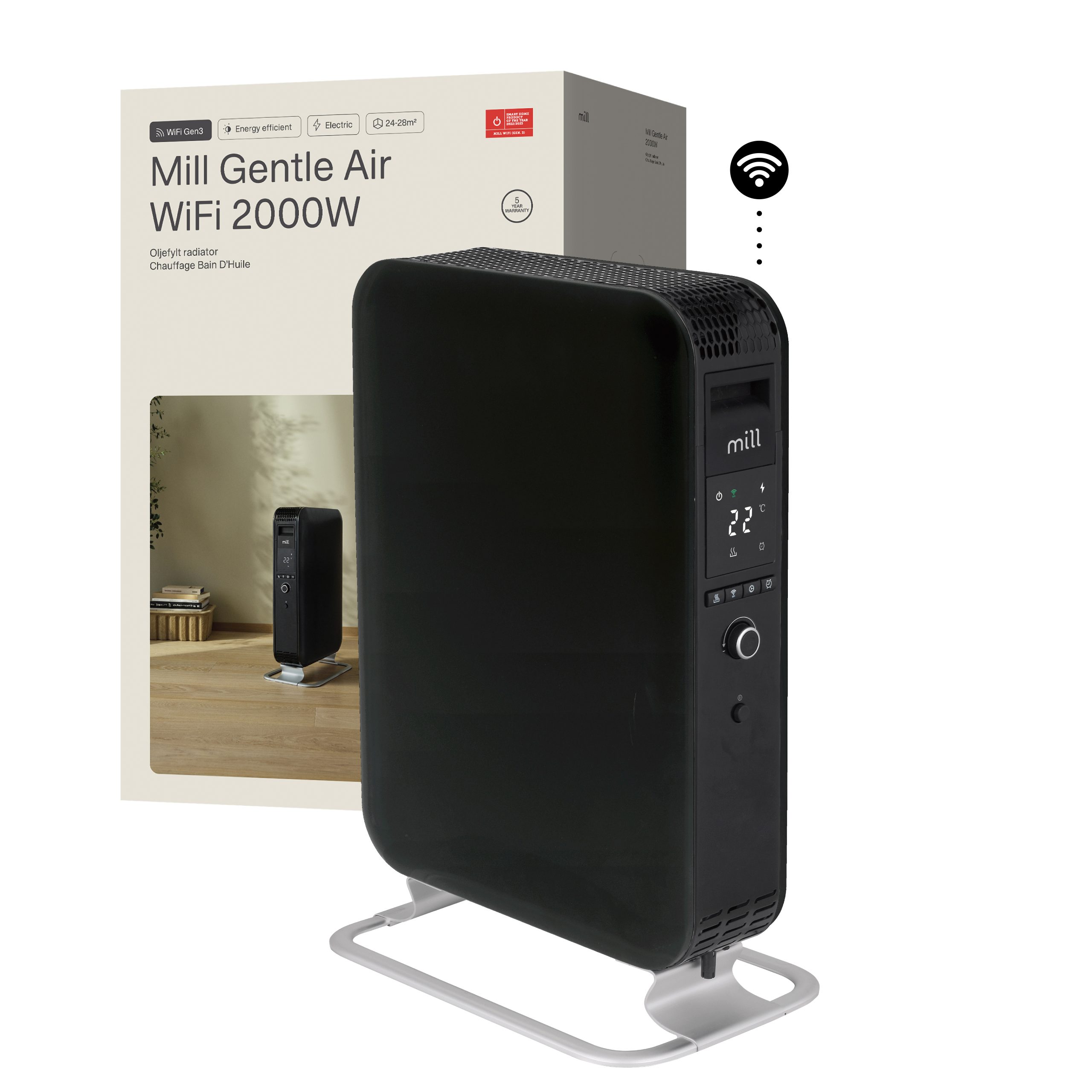 With Mill WiFi heaters, you can easily control your heaters from your smartphone ensuring comfortable temperatures at any time without wasting electricity. An oil-filled radiator never looked better – if we dare say so ourselves! The Mill Gentle Air has an elegant, modern design, and resting on a stand it looks as if the heater is gently floating in the air. The portable, stylish heater is quiet and safe to use without supervision. Living up to its name, the Mill Gentle Air is a gentle heat source that neither burns dust nor dries out the indoor air. With its unique closed shape, it spreads the heat around the room a lot faster compared to traditional oil-filled radiators. This makes it heat up a room 29% faster, as the closed shape forces the hot air to rise faster, distributing the heat more efficiently. We call it Mill Heat Boost Technology.