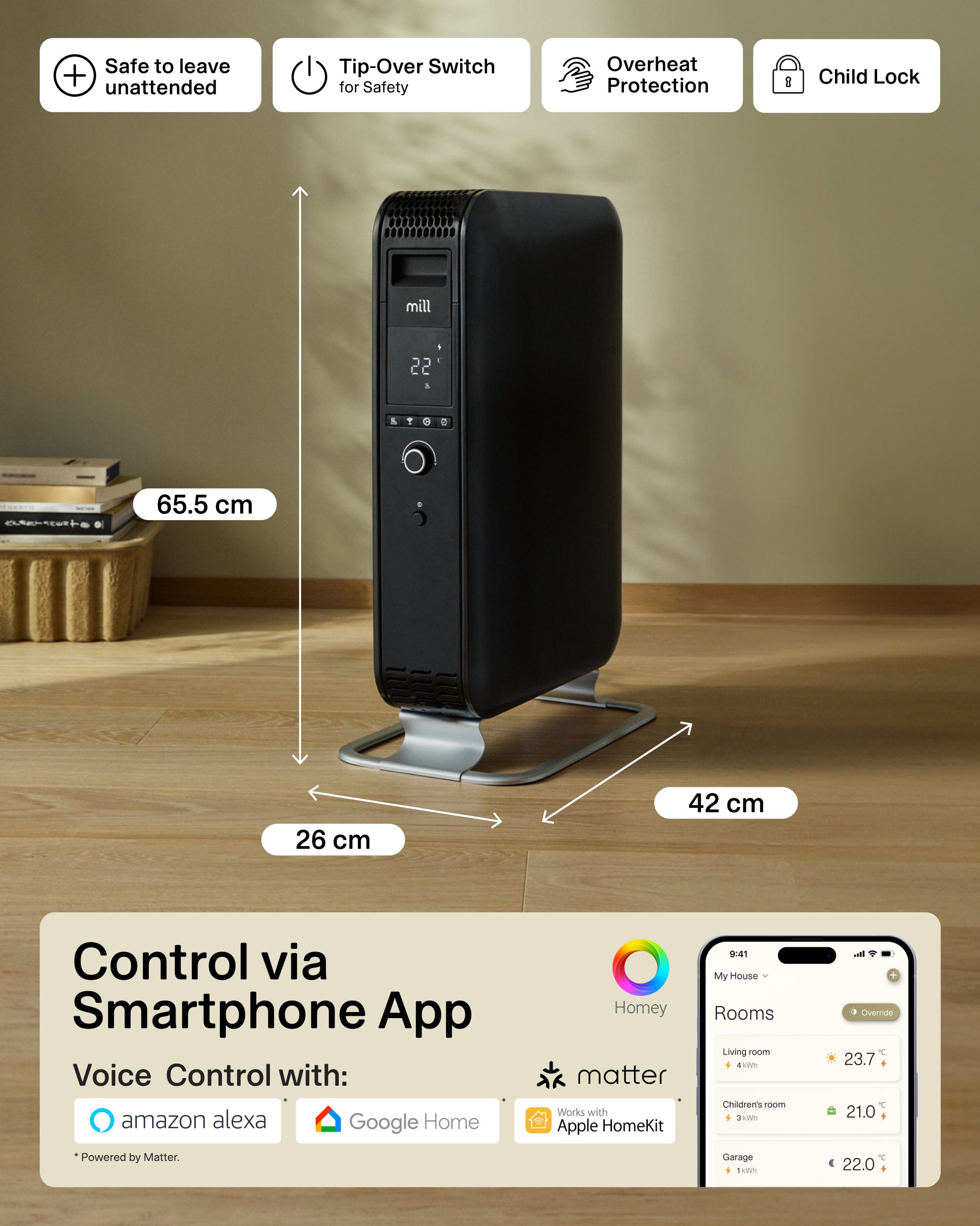 Activate the child lock in the Mill app to lock all buttons on the control panel of the heater. This prevents nosy little fingers from adjusting the temperature, or turn the heater on and off.