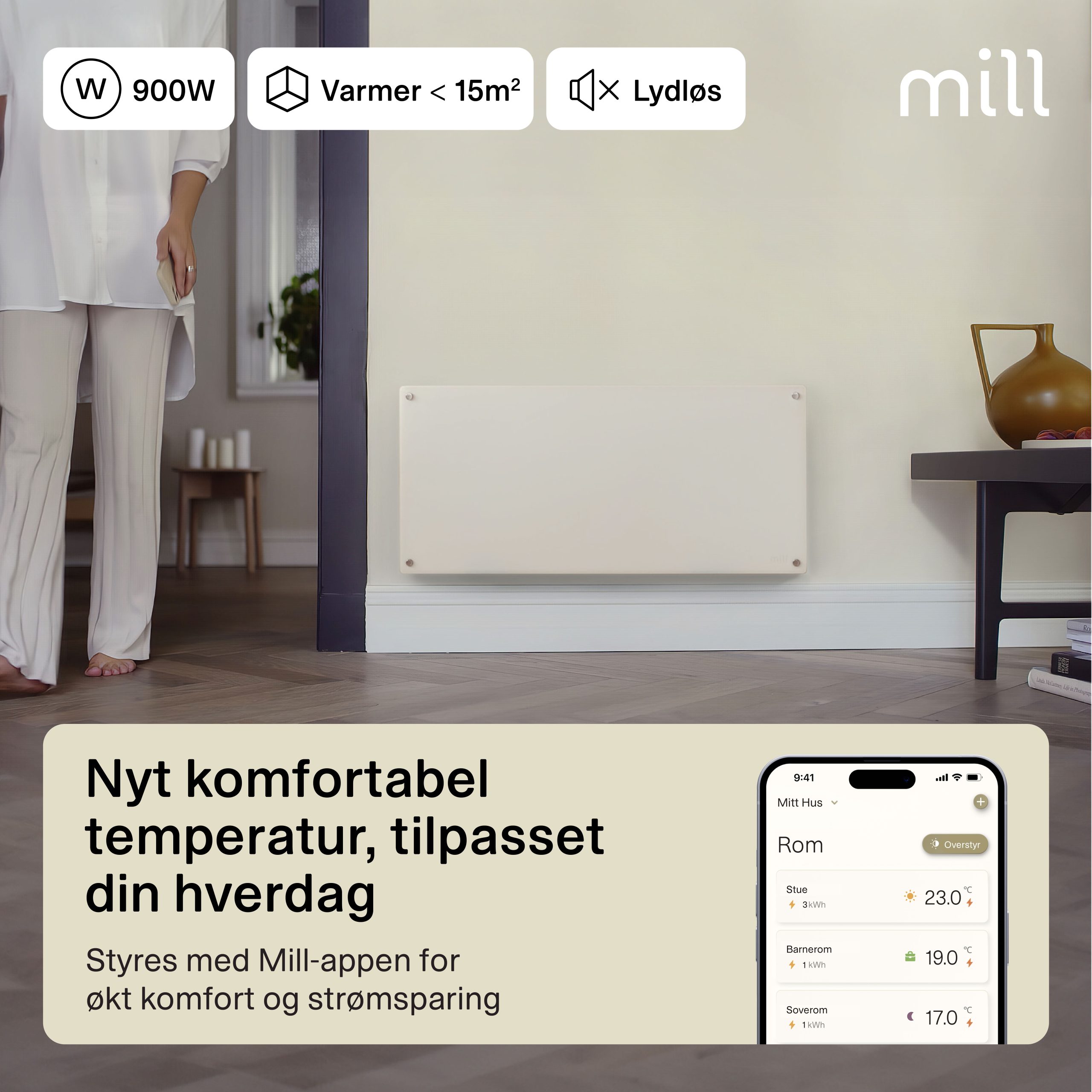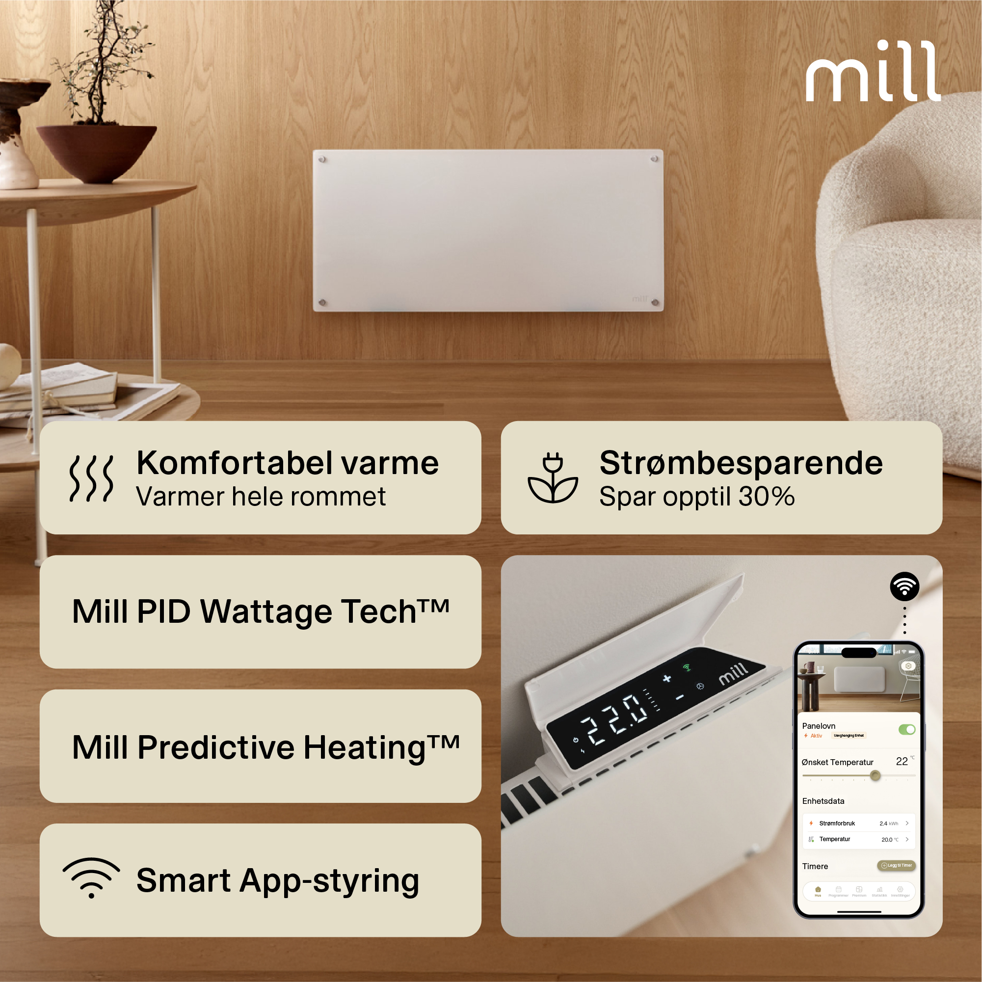 Mill Glass Smart WiFi Panel Heater generation 4 is a high-tech and energy-efficient panel heater with a clean, modern look that blends seamlessly into all types of homes. The Mill heaters are designed in Norway and come in a minimalist Scandinavian design. With support for Matter, Zigbee 3.0 and WiFi, this is one of the most future-proof heaters on the market – ready for the smart home, whatever platform you use.