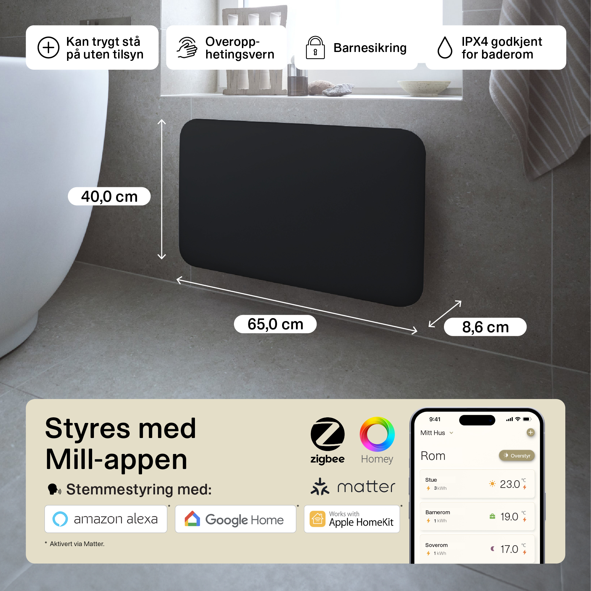 Mill WiFi generation 4 panel heaters now come with Matter support, so you can control the temperature in the same app as your other smart home products, if you wish. With Matter you can now easily regulate the temperature with voice control via Amazon Alexa, Apple Home and Google Home.