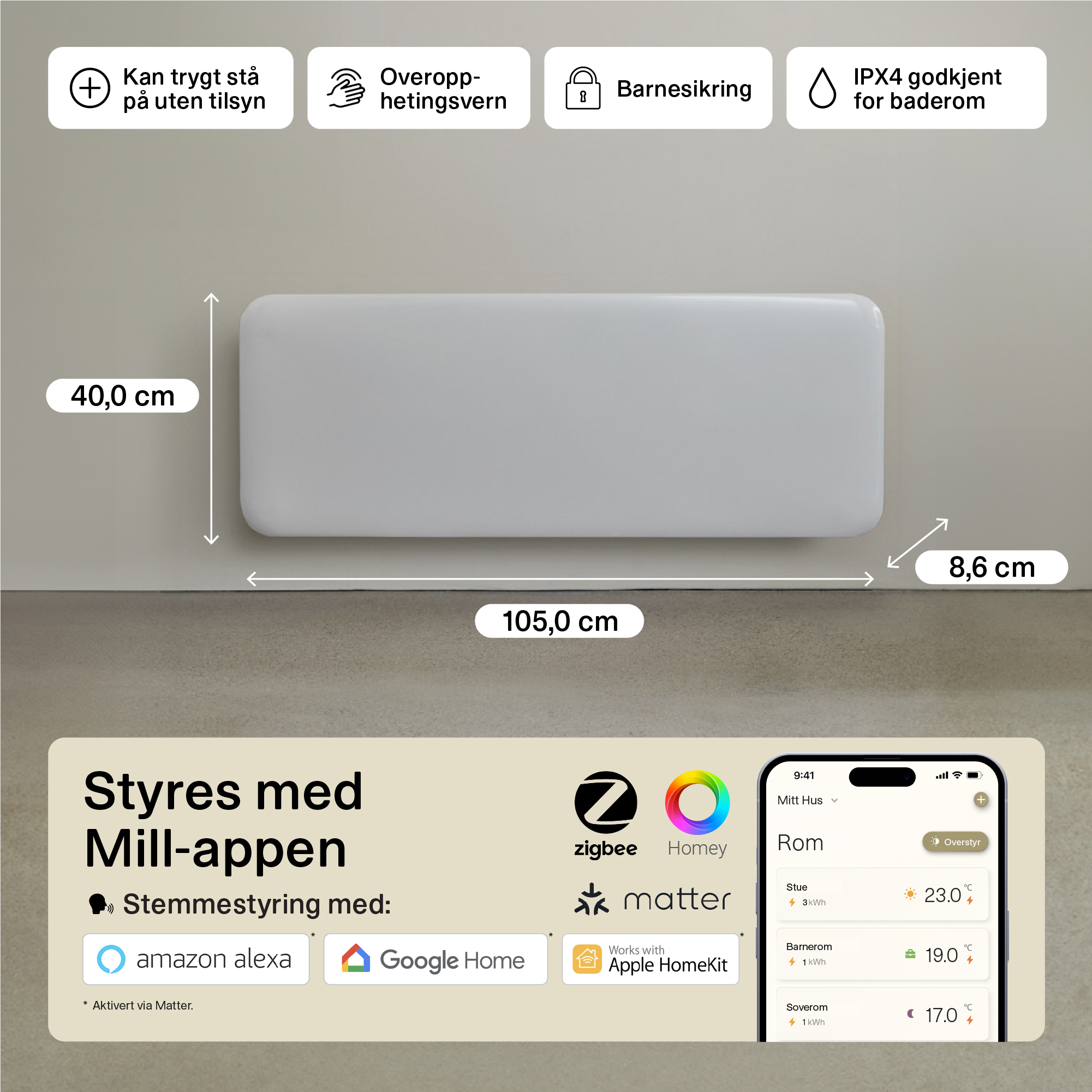 Mill WiFi generation 4 panel heaters now come with Matter support, so you can control the temperature in the same app as your other smart home products, if you wish. With Matter you can now easily regulate the temperature with voice control via Amazon Alexa, Apple Home and Google Home.